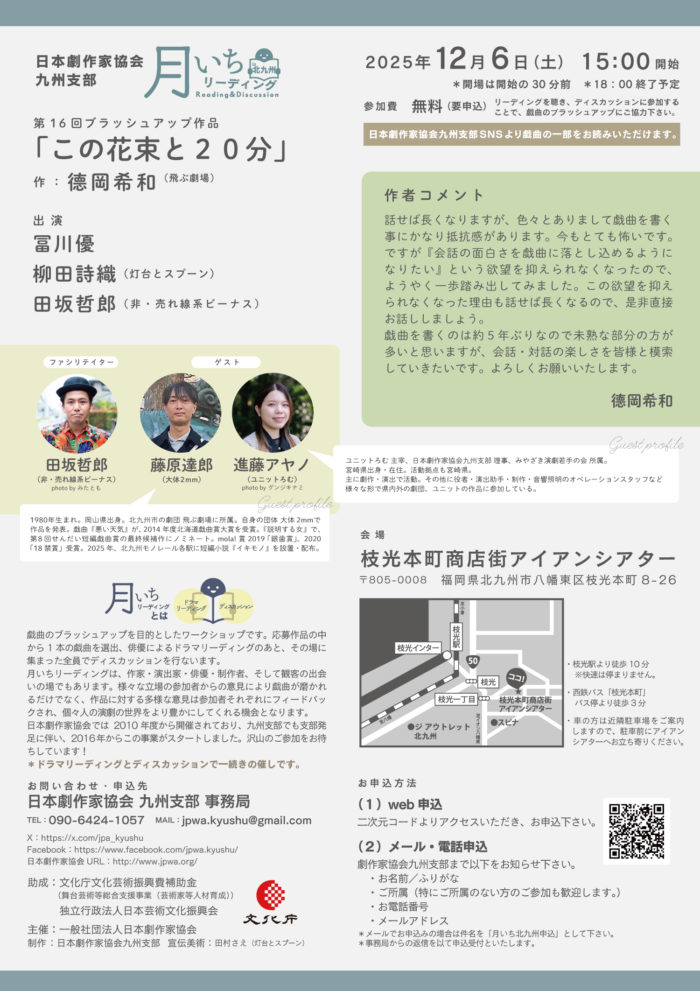 (日本劇作家協会九州支部さんの月いちリーディングチラシは今回も田村が制作させていただいております!)